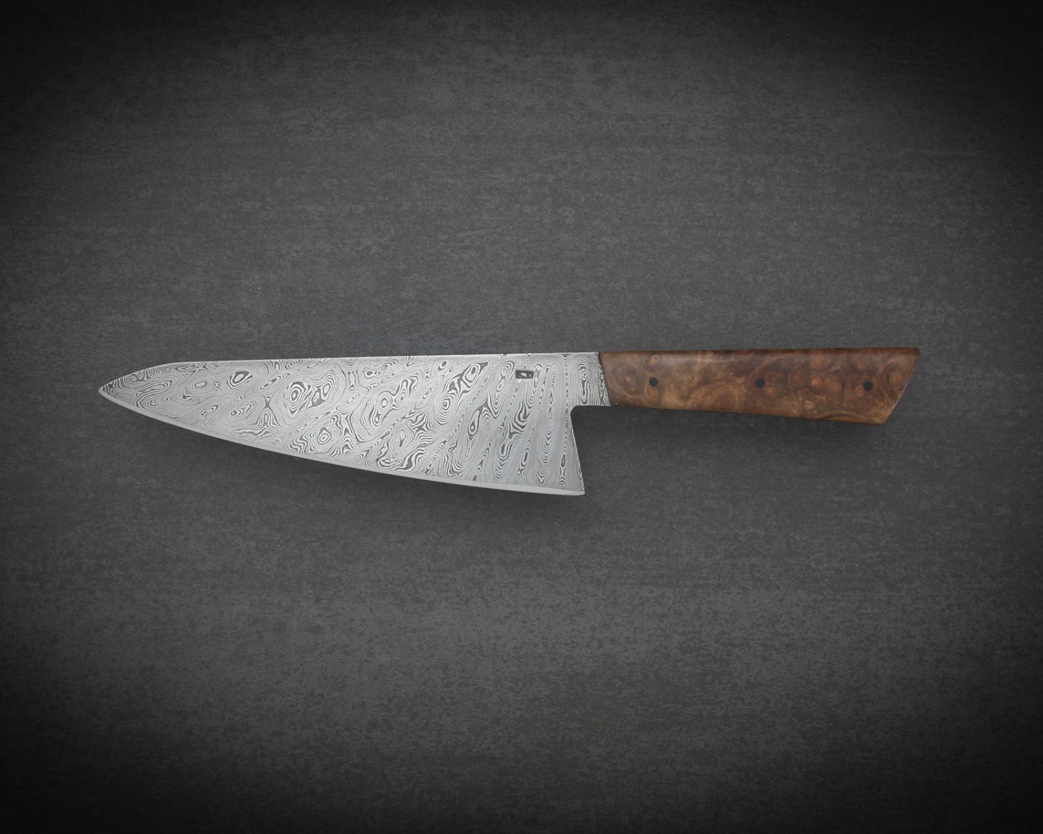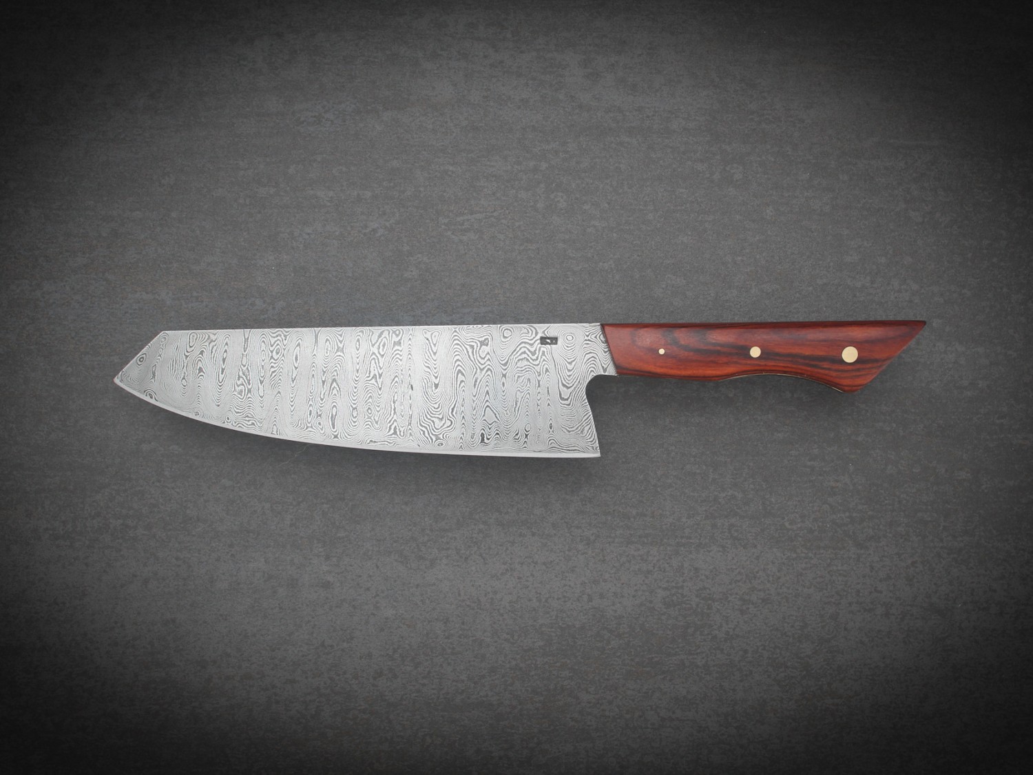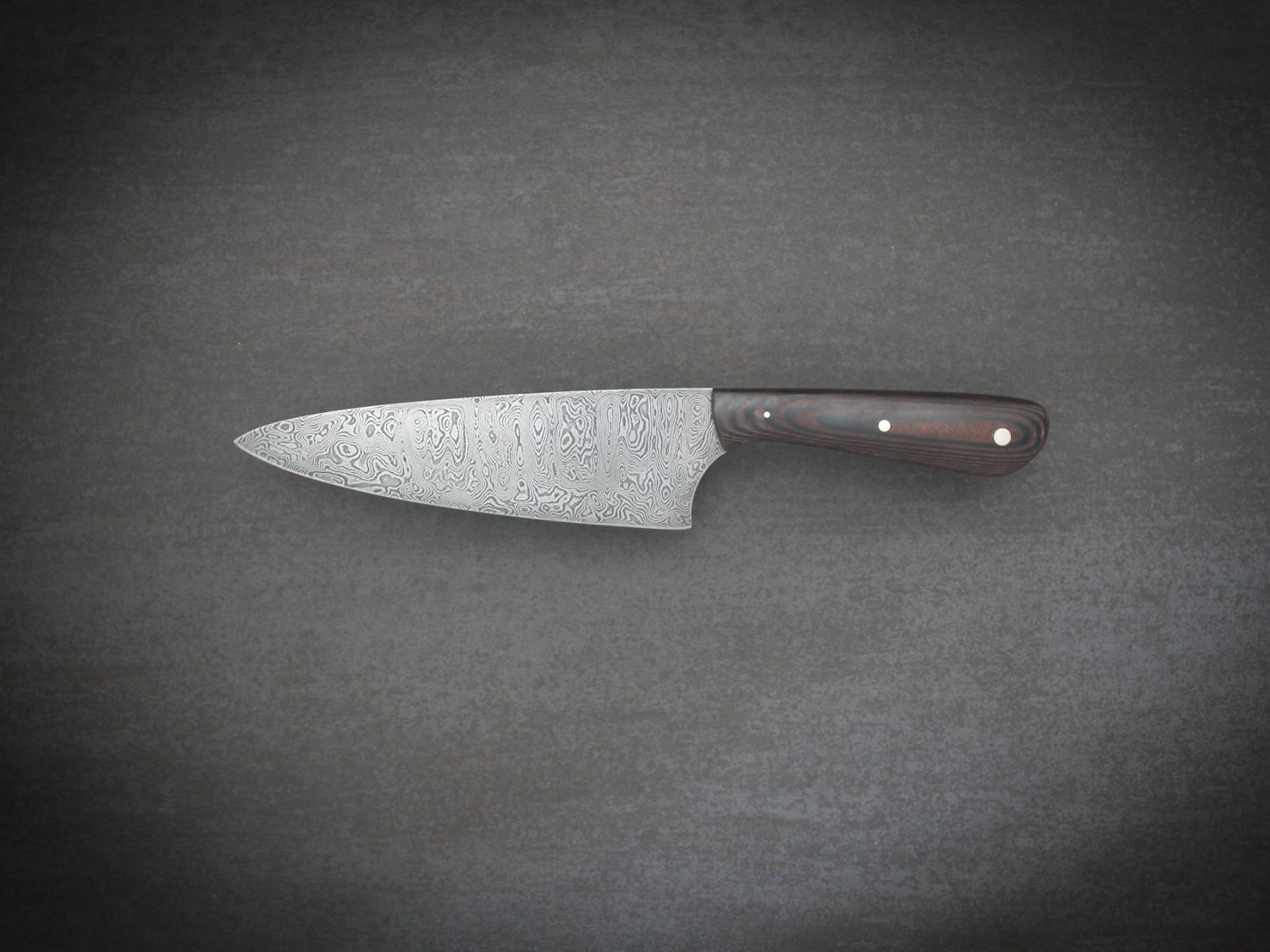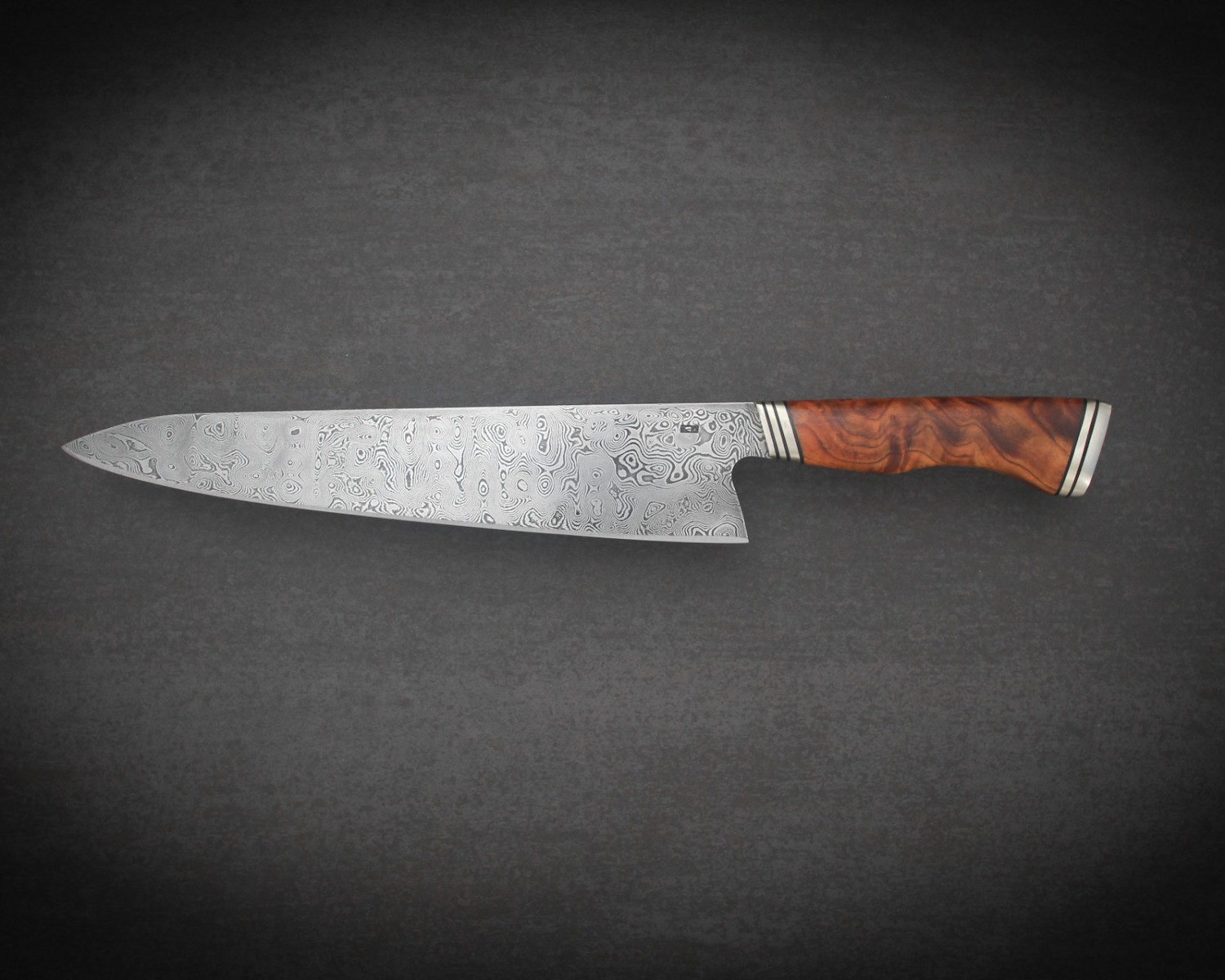Zum Beispiel: Küchenmesser mit Griffschalen. Standarddamast ca. 150 Lagen. Klingenlänge ca. 20cm. Ab 950.-€